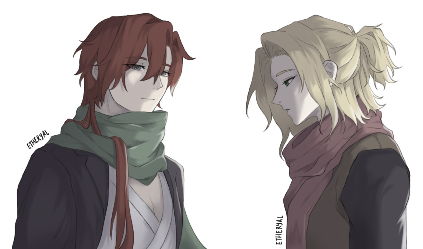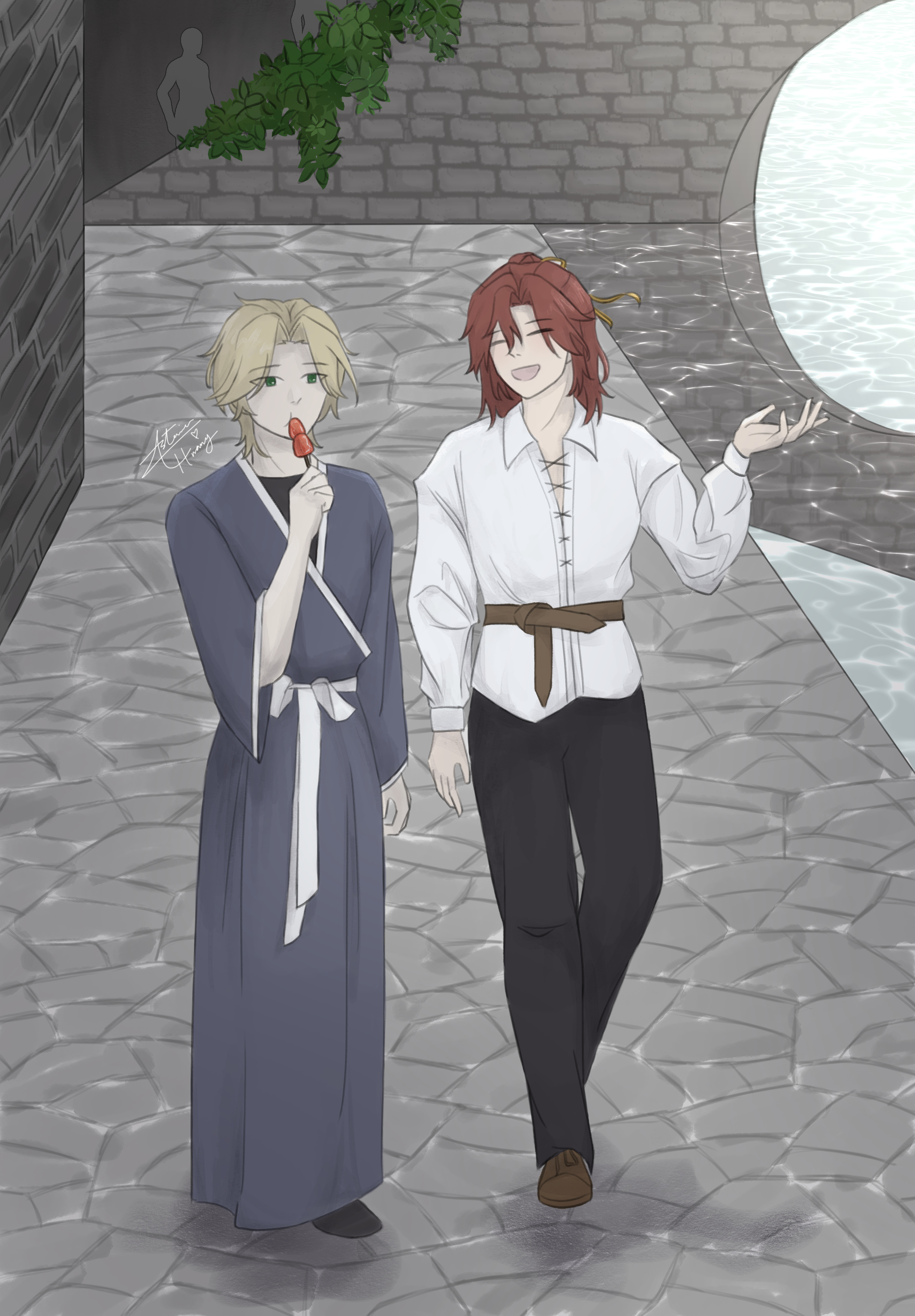 In addition to the characters, I've always liked experimenting with new ways of telling stories and a having a non-linear timeline was the perfect way to do that. Compared to my first story, the plot plays a bigger role in this one, but even then, I've cut out filler scenes so everything is there with a purpose. The splitting between chapters is a bit uneven, because my original plan was just a very long one-shot story. Only halfway through did I decide to break it into chapters, and alternating the chapters clearly between the present timeline and the past one felt like the most appropriate way to do so. This novel took way longer to write than my first, especially because I started college. It was a bit of a pain to write sometimes and there was a day I had to sit down and spend over an hour writing down the full timeline because I was starting to confuse myself, but it was worth it and I really liked how this novel turned out. I've also written a short prequel that can be found here, though I'd suggest only reading it after the main story. On the right is a small illustration I did for the side story because I couldn't bear to part with these characters so soon... Anyway, if you decide to read my novel, I hope you'll enjoy it as much as I enjoyed writing it!