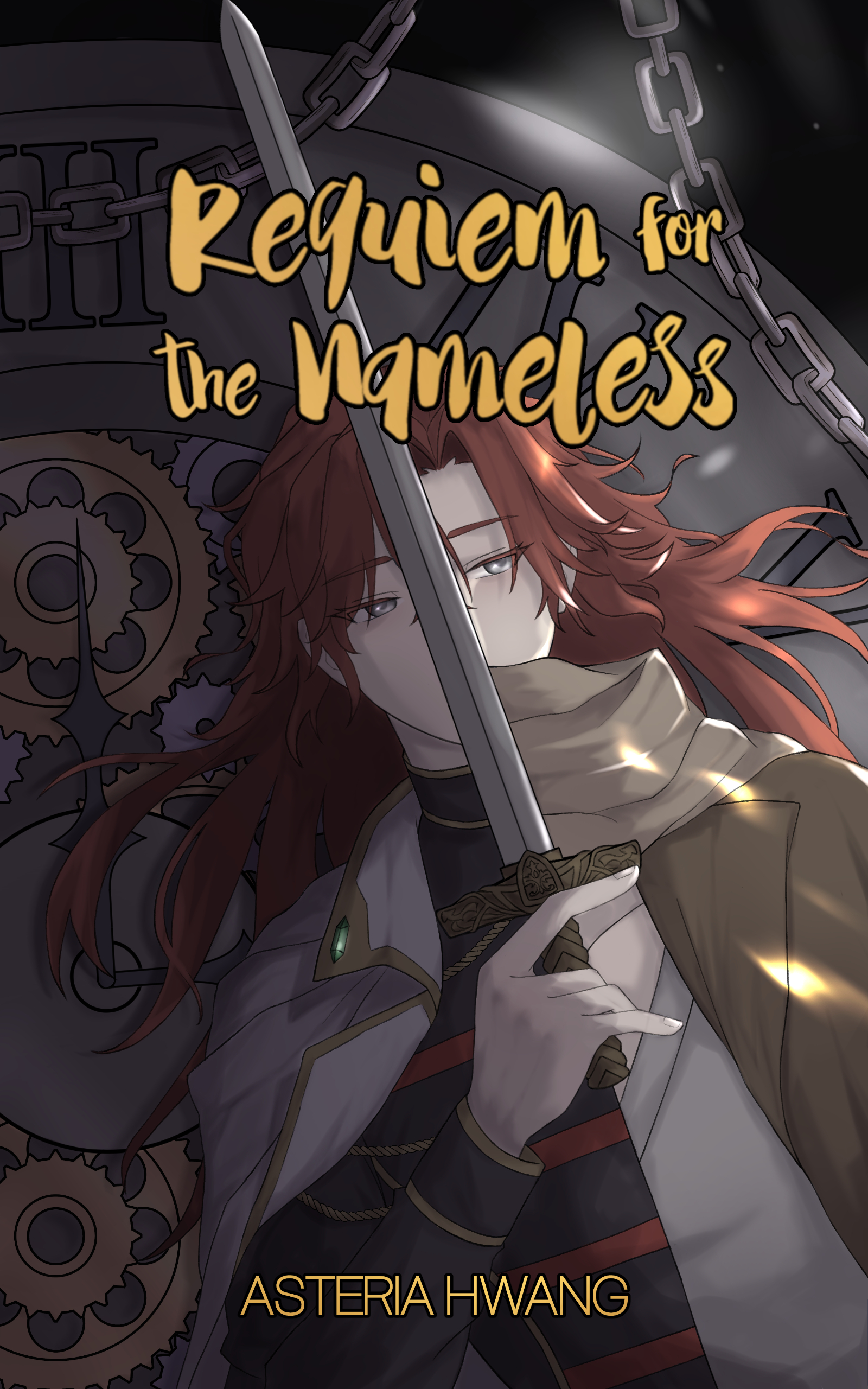 The cover of the book features the main character holding a sword that divides his attire into two. The left side represents his past (before the story took place), while the right represents his present. Rather than have the distinction be between timelines, it felt more suitable to contrast a glorious period of his life with the one afterwards in which he struggles to believe that he deserved it. The background alludes to the element of time travel while the chains imply that he's trapped in some way, as his mind continues to remain stuck on the past.
